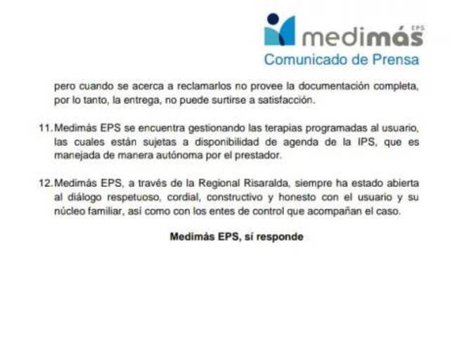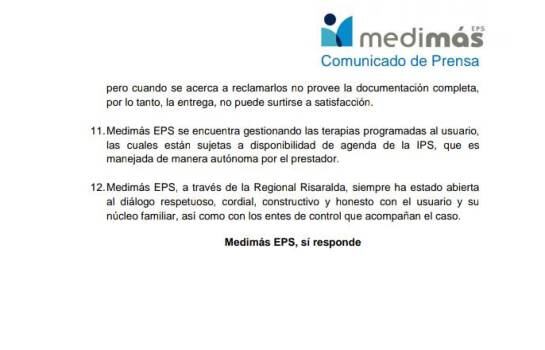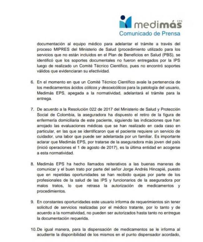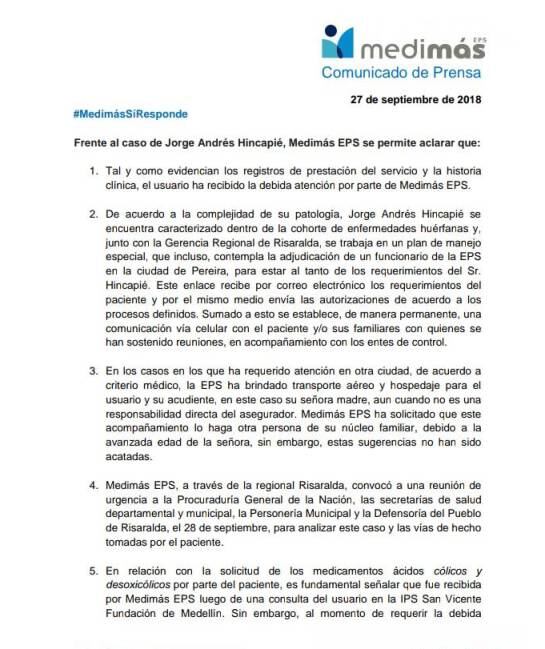 Medimás a través de un comunicado a la opinión pública, aclaró el hecho y en doce puntos explica la situación del paciente Jorge Andrés Hincapié.