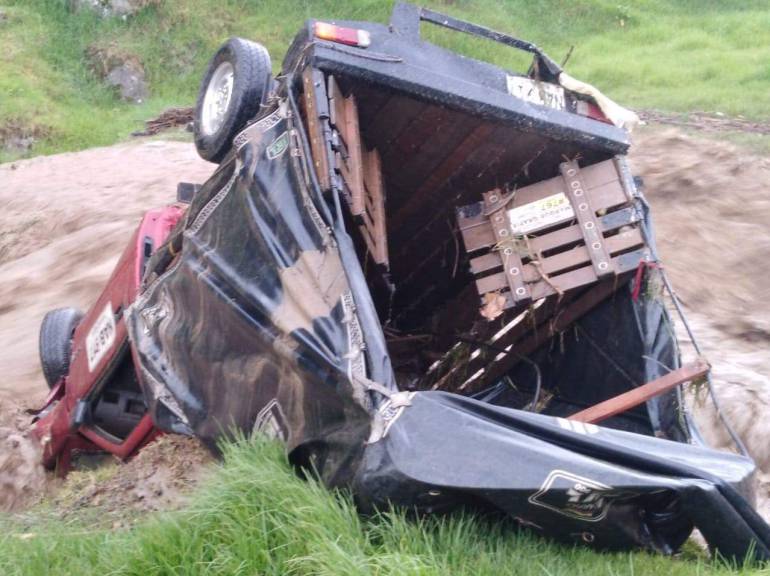 El cuerpo oficial de bomberos de Manizales informó que la fuerza del agua hizo que la camioneta quedara con las llantas hacía arriba, unos metros más abajo de la carretera, que es destapada y comunica a Lusitania con el sector La Subestación de La Enea y más adelante con Gallinazo.