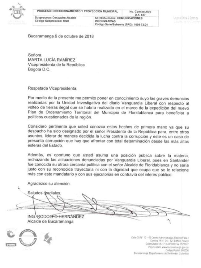 El alcalde de Bucaramanga escribió una muy curiosa carta a la vicepresidente Martha Lucía Ramírez denunciando que uno de sus ahijados incurre en presuntos actos de corrupción.