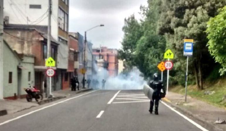 Alrededor de 50 personas encapuchadas permanecen frente a las instalaciones de la Universidad Distrital, sede Macarena en Bogotá. En el lugar se presentan enfrentamientos con el Esmad de la Policía.