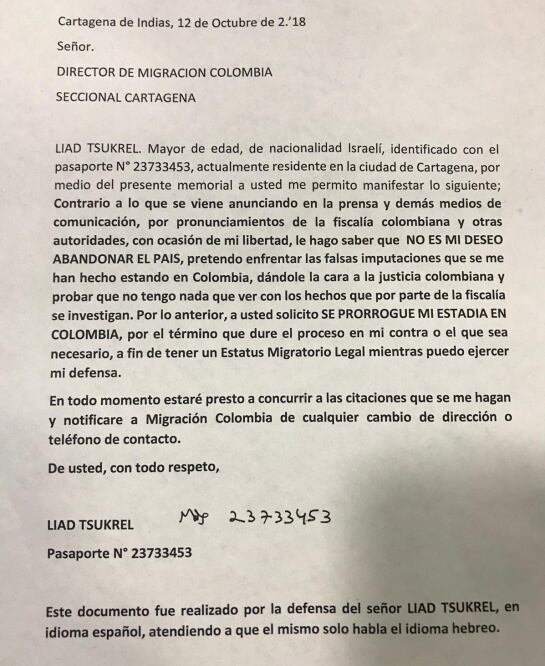 Dijo que su cliente indicó a Migración Colombia que su intención no es salir del país y su deseo es demostrar su “inocencia” ante las autoridades colombianos por este proceso.