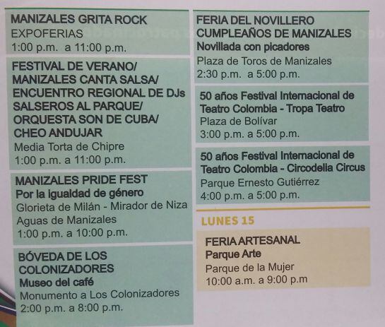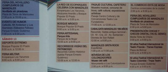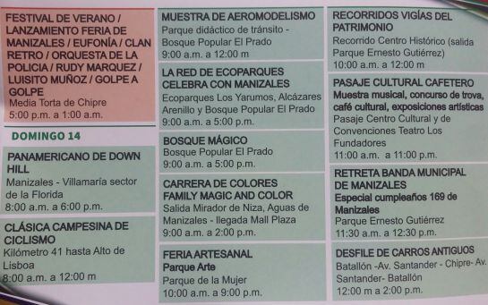 La programación incluye la siembra de 12.000 árboles, feria artesanal, concurso de trova, festival de tango, feria del novillero noche de bolero, inauguración de un museo del café en el Monumento a Los Colonizadores y del estadio de fútbol aficionado, panamericano de down hill, desfile de carros antiguos, Manizales Grita Rock, Festival de Verano y cabalgata, entre otras actividades.