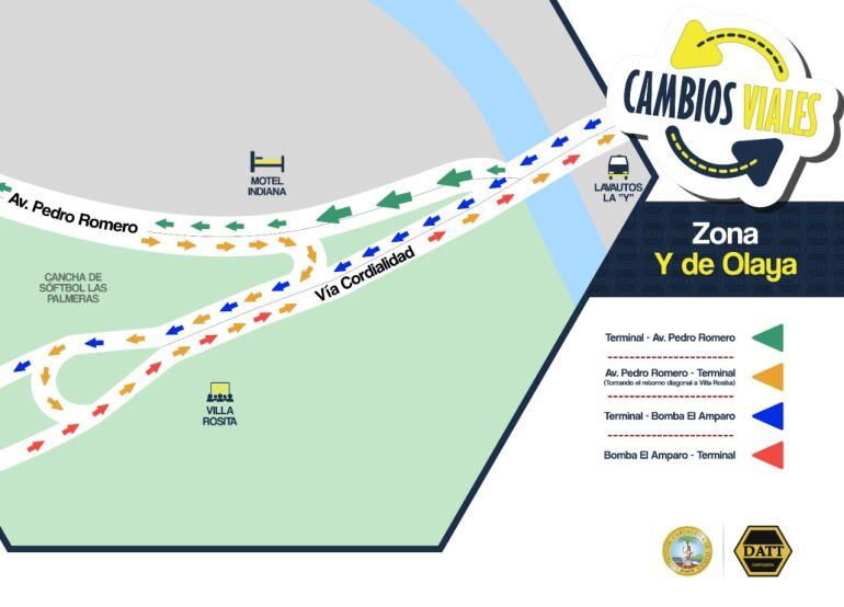 Ahora el flujo vehicular que proviene de la avenida Pedro Romero hacia la Terminal no llegará hasta la Y de Olaya, sino que debe tomar el retorno diagonal al motel Indiana girar hacia la izquierda, tomar la avenida la Cordialidad hasta el retorno ubicado en inmediaciones del canal Calicanto, junto la urbanización Villa Rosita y de ahí hacia la Terminal de Transporte.
