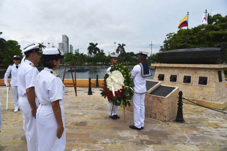 Una la ofrenda floral, impuesta por el señor Capitán de Navío Carlos Arturo Rodríguez Espinosa, Jefe de Estado Mayor de la Fuerza Naval del Caribe encargado, acompañado por la Señora Capitán de Navío Beatriz Helena García, Fiscal Penal Militar; el señor Capitán de Navío John Ruiz Murcia, Subdirector de la Escuela Naval de Cadetes “Almirante Padilla” y el señor Jefe Técnico (RA) Víctor Núñez, veterano de la Guerra de Corea, ante el monumento a los héroes de la Guerra de Corea recordó el valor de miles de colombianos que lucharon por la defensa de la paz, la justicia y la libertad del hermano país.