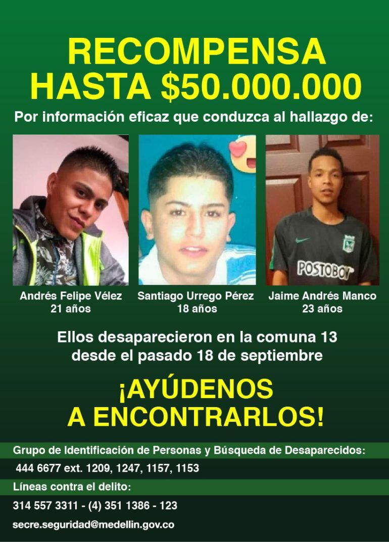Casi dos meses llevan desparecidos tres jóvenes de la comuna trece y aun no se sabe nada de su paradero y tampoco si están con vida. Debido a esta situación, la alcaldía de Medellín ofrece hasta 50 millones de pesos para quien entregue información que permita la ubicación de ellos.