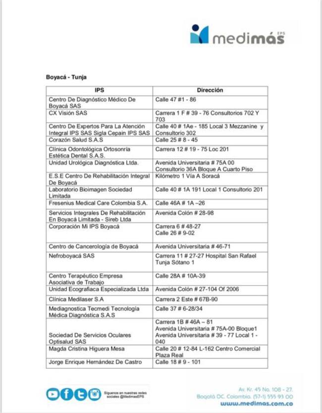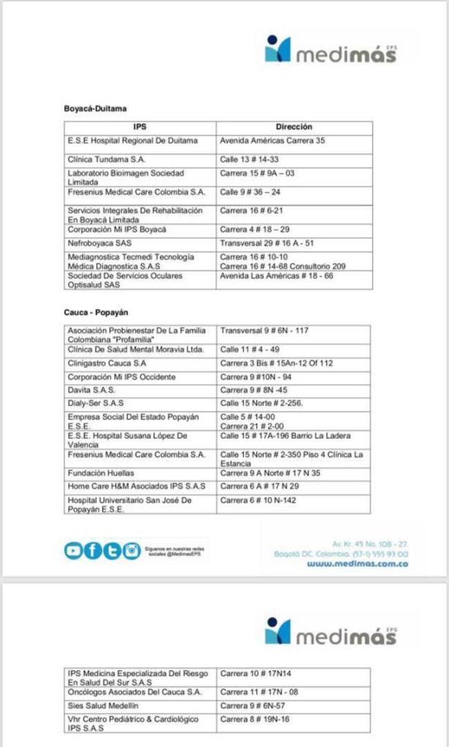 Medimás EPS indicó que red de IPS habilitadas para la atención de los usuarios, contempla a los siguientes centros asistenciales: