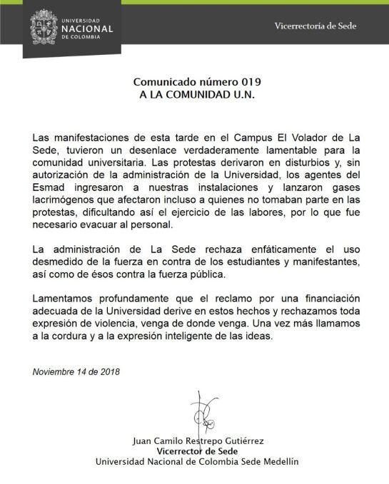 Universidad Nacional Medellín rechaza abuso de autoridad policial