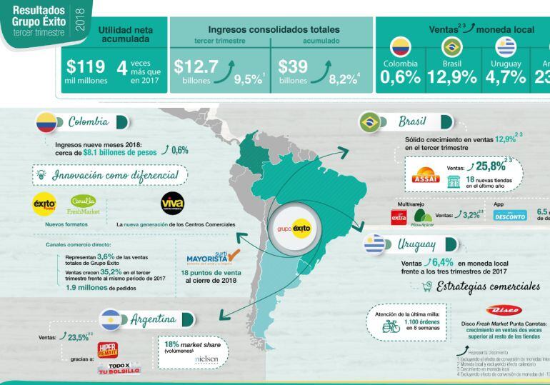 Las ventas en los cuatro países donde la compañía opera registraron crecimientos en moneda local durante el tercer trimestre del año: Colombia 0,6%, Brasil 12,9%, Uruguay 4,7% y Argentina 23,5%