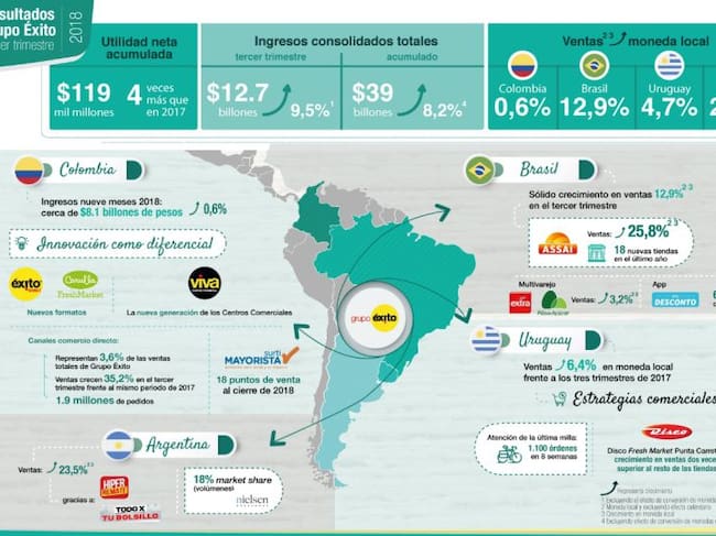 Según el informe, en el tercer trimestre del año Grupo Éxito tuvo ingresos consolidados totales por $12,7 billones de pesos con un incremento de 9,5% -antes del ajuste por diferencia en cambio-, y en el acumulado se registraron $39 billones de pesos con un crecimiento de 8,2% frente al mismo periodo del año anterior