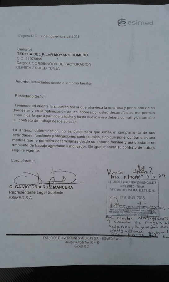 A través de una carta, la representante legal suplente de Esimed S.A, le pidió a los empleados en Boyacá, que "cumplan sus actividades, funciones y obligaciones contractuales desde su entorno familiar”, mientras se supera la contingencia por la que atraviesa la empresa.