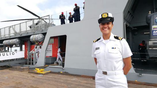 Con una sonrisa que no cabía en su rostro se encontraba la Teniente de Corbeta Pamela Armesto, minutos antes de que el Buque ARC 20 de Julio levantara sus anclas del río Magdalena, frente al Gran Malecón de Barranquilla, para partir a la V Expedición Científica a la Antártida 'Almirante Campos'.