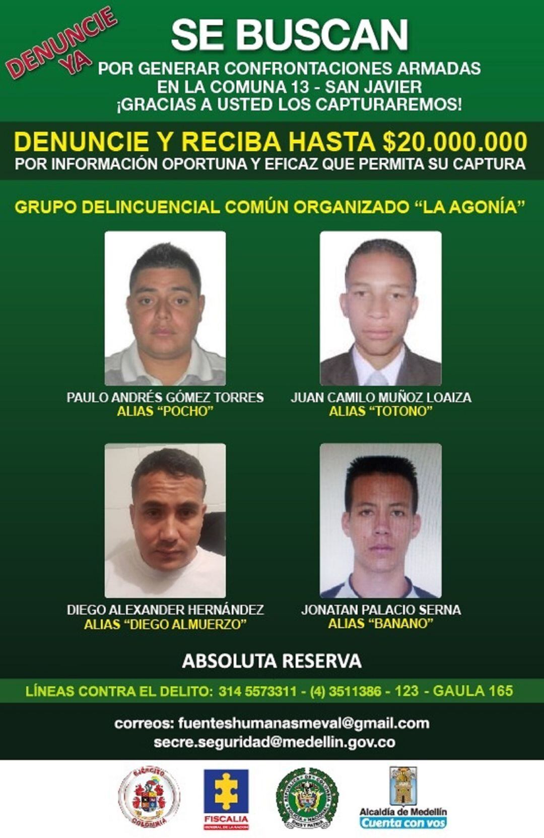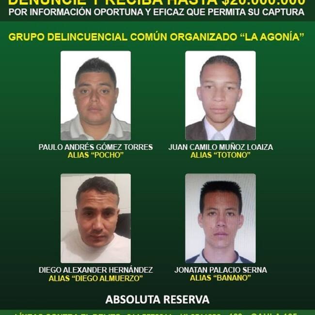 En el cartel aparecen alias Pocho, Totono, Diego Almuerzo y alias Banano, por quienes las autoridades ofrecen 20 millones de recompensa para quien brinde información que lleve a su captura.