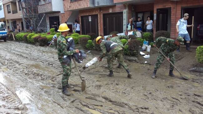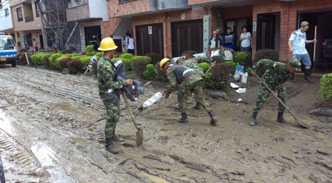Oficiales, suboficiales y soldados de la Cuarta Brigada, acompañados de maquinaria amarilla emprendieron tareas de ayuda desde el inicio de la emergencia invernal, en la remoción de lodo y escombros de un sector del barrio La Guadalajara en el municipio de Copacabana, norte del Valle de Aburrá.