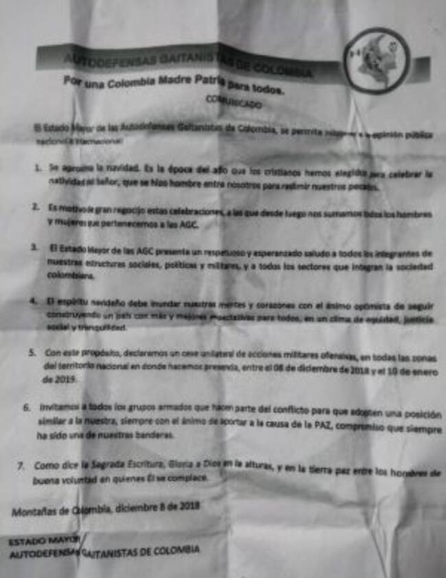 Mediante un panfleto que circuló el pasado ocho de diciembre en el municipio de Apartadó, corregimiento San José, presuntamente las Autodefensas Gaitanistas de Colombia, también conocidas como el Clan del Golfo, anunciaron un cese de acciones ilegales durante las fiestas de navidad.