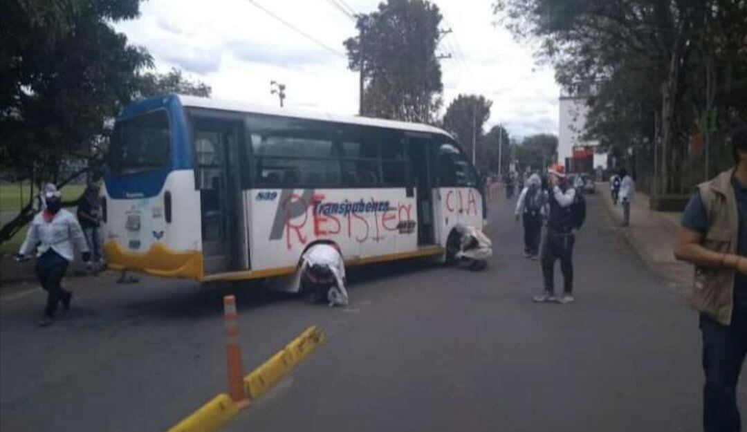 En medio de los fuertes disturbios un bus de servicio urbano quedó en medio de la protesta y fue atacado con grafitis y a piedra.