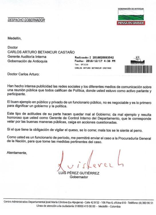 El gobernador de Antioquia, Luis Pérez Gutiérrez, pidió a la Procuraduría investigar por presunta participación en política, al funcionario de su administración Carlos Arturo Betancur Castaño quien es el gerente de Control Interno.