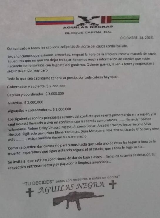 El escrito circuló en los municipios de Caloto, Corinto, Tóez, El Palo y López Adentro, firmado por el Bloque Capital D.C. de las Águilas Negras donde ponen precio a las vidas de distintos líderes del proceso organizativo indígena del norte del Cauca, en especial a las autoridades, la guardia indígena y contra varios líderes del Plan de Vida Proyecto Nasa y del resguardo de Huellas Caloto.