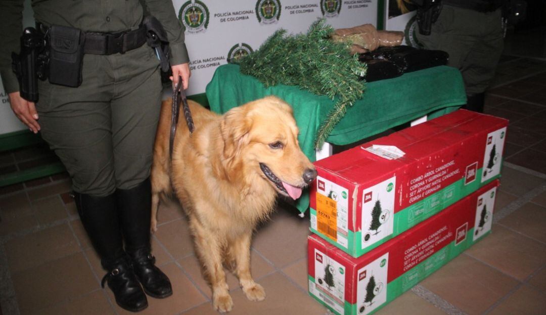 Escondida entre una caja de árboles de navidad la Policía Metropolitana de Bucaramanga halló 5 kilos de marihuana tipo Cripy. Un canino antinarcóticos de nombre Yoryim fue clave para descubrir los 10 paquetes rectangulares con la droga.