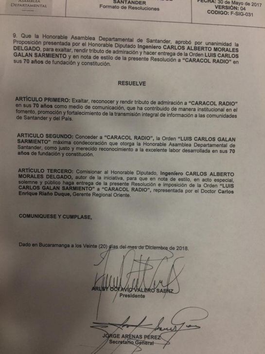 En una iniciativa liderada por el diputado Carlos Alberto Morales Delgado, se aprobó unánimemente otorgar a Caracol Radio Bucaramanga la máxima distinción que se entrega a las entidades y personas que se destacan por su labor, la orden Luis Carlos Galán Sarmiento.