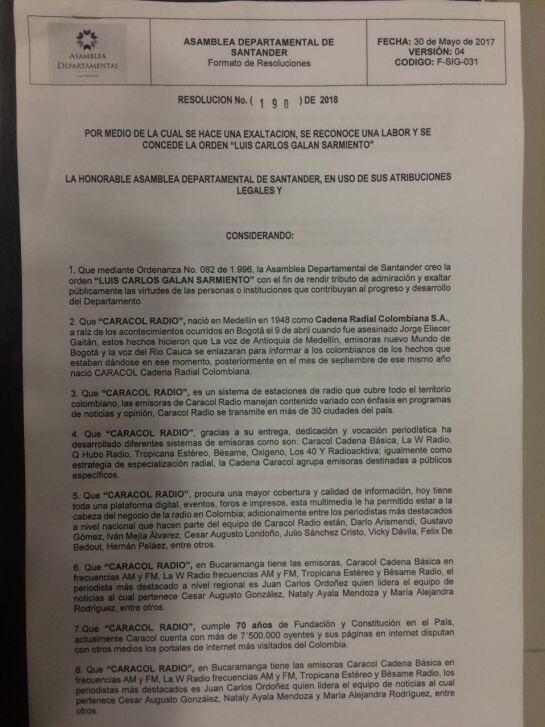 La resolución que rinde homenaje a Caracol Radio en aus 70 años dice lo siguiente: