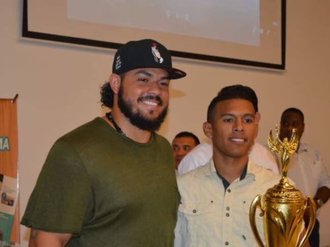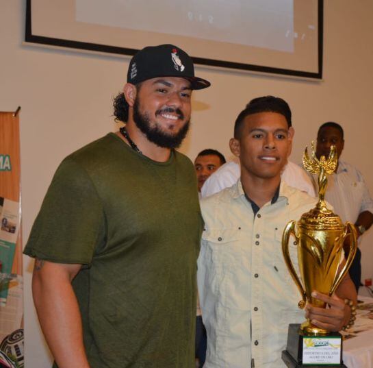 Verbel Paternina recibió el trofeo otorgado por Acord Sucre de manos del beisbolista grandes ligas, Jorge Mario Alfaro, deportista del año de Sucre en 2017.