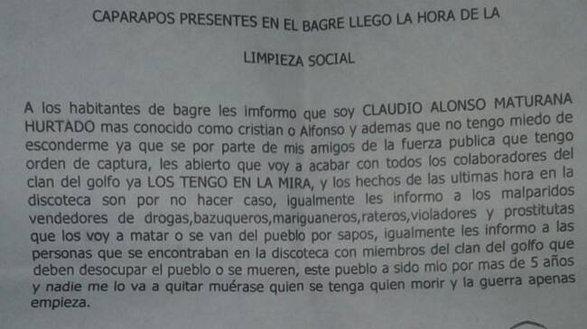 En el pasquín que ha circulado en esa localidad, se amenaza de muerte a supuestos colaboradores de la banda criminal Clan del Golfo. El escrito está firmado por alias Negro Cristian, presunto delincuente de Los Caparrapos, quien se atribuyó el atentado con granada el pasado fin de semana en el que quedaron heridas 25 personas, además, exige que las personas que estuvieron esa noche en la discoteca tienen que abandonar el pueblo, porque se autoproclama dueño del municpio de El Bagre.