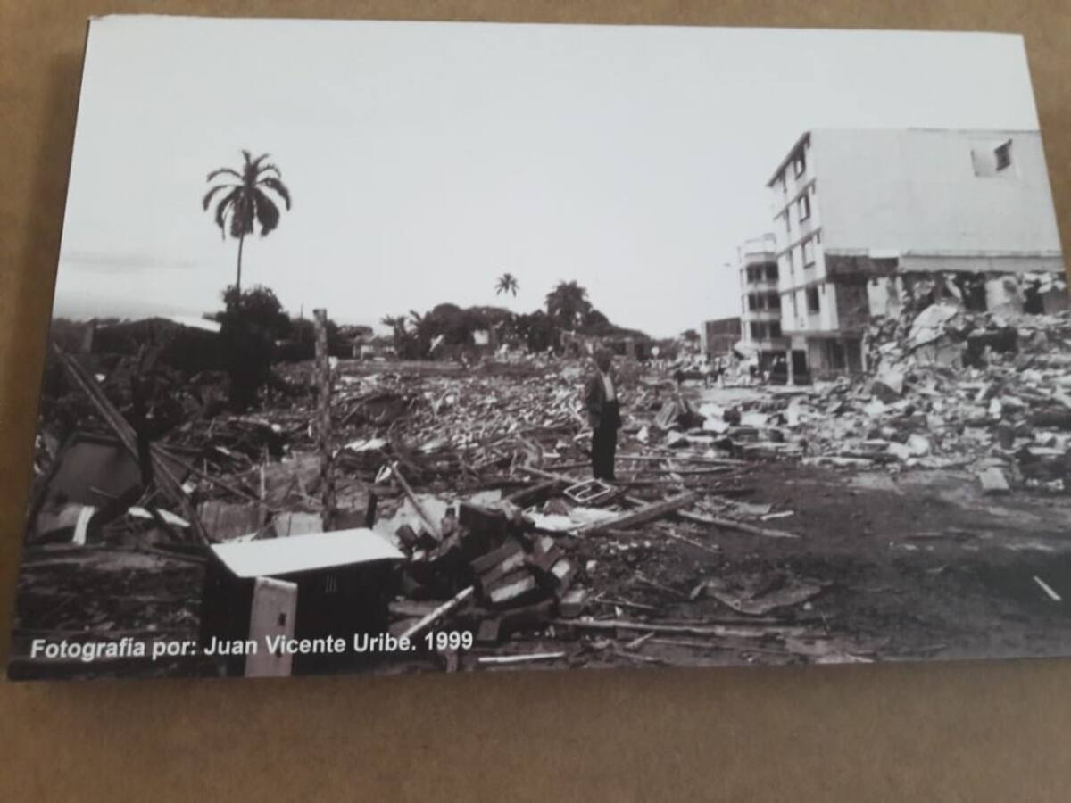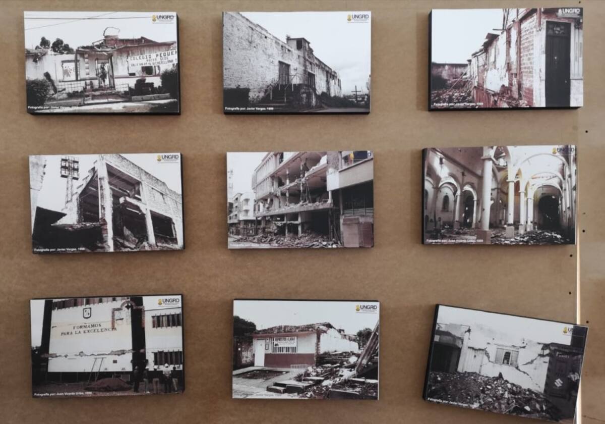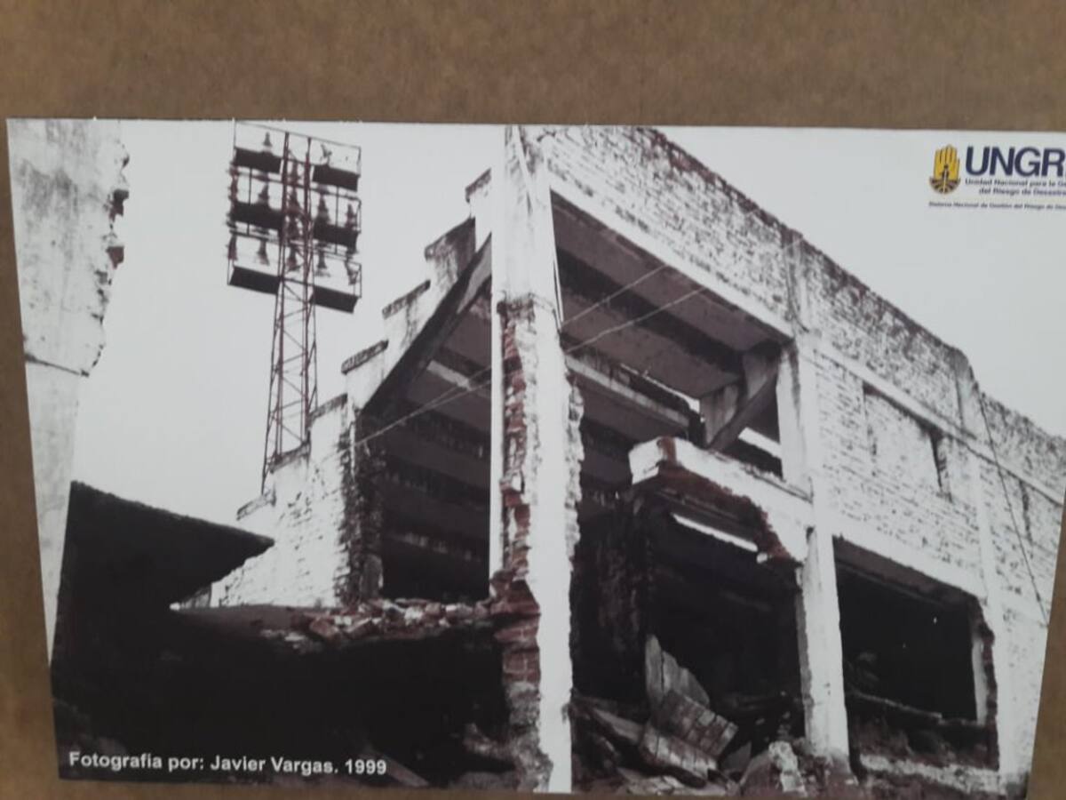En el Centro de Convenciones de Armenia se realizara el Encuentro Nacional de Riesgo Sísmico donde hay una exposición de fotografías en blanco y negro de las afectaciones por el terremoto.