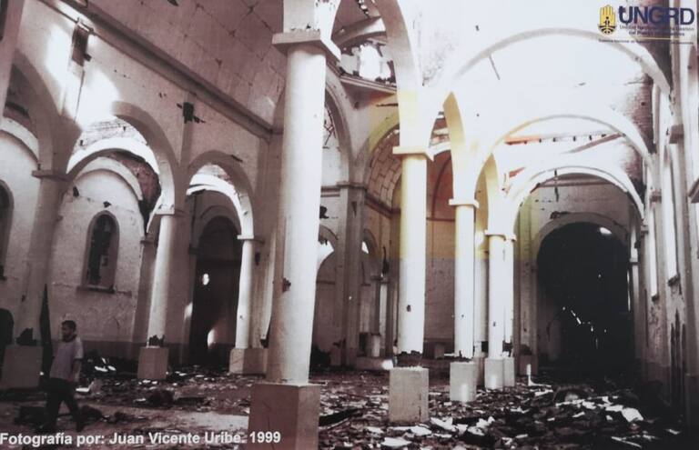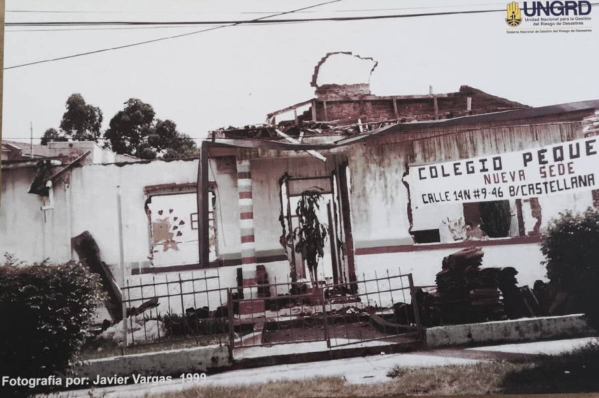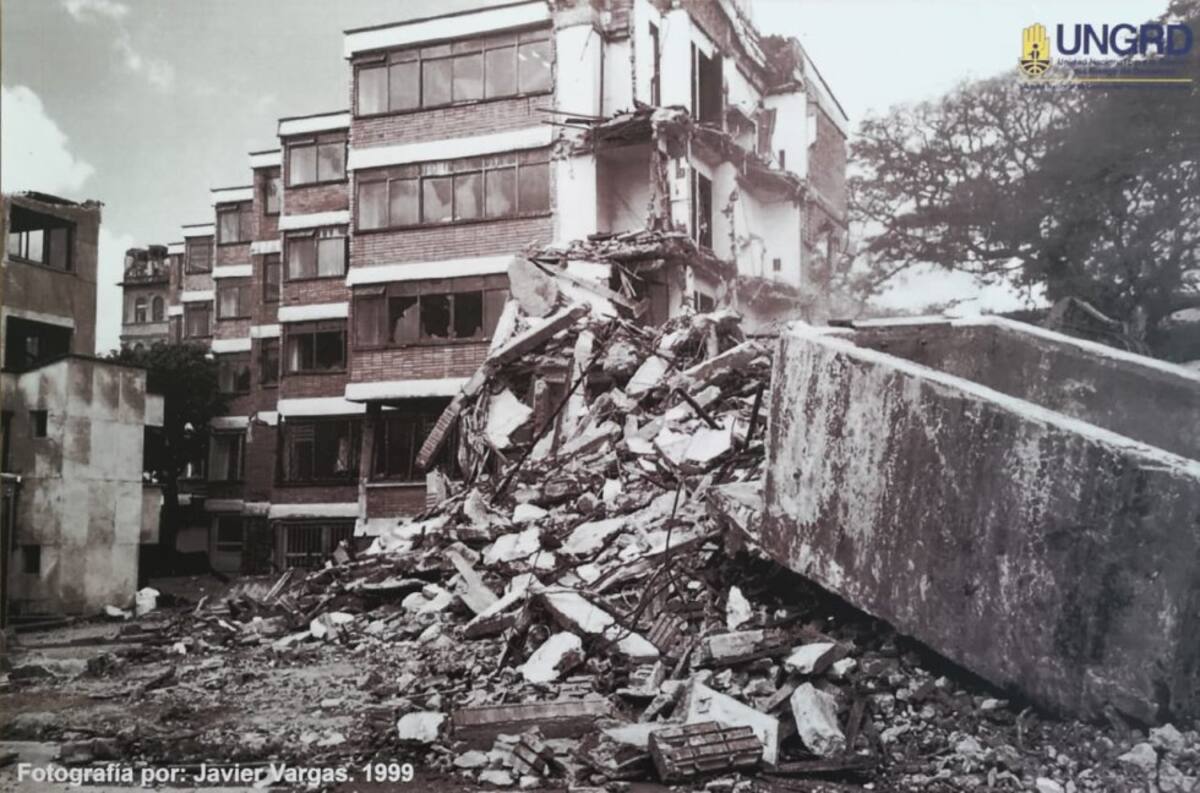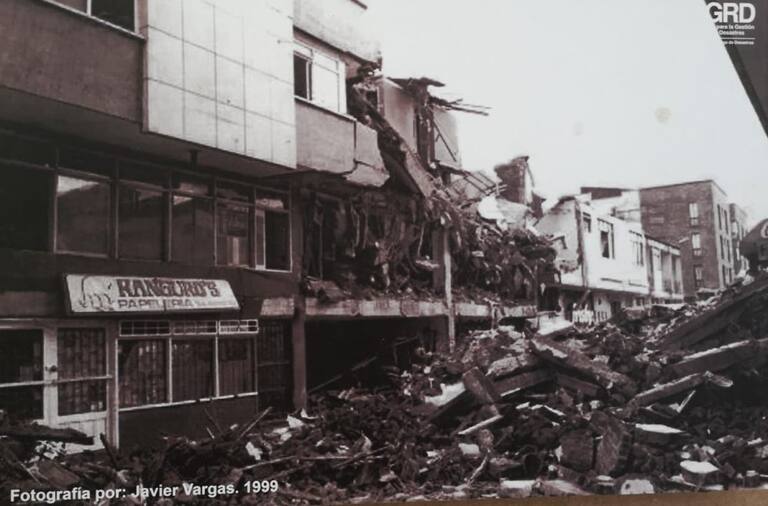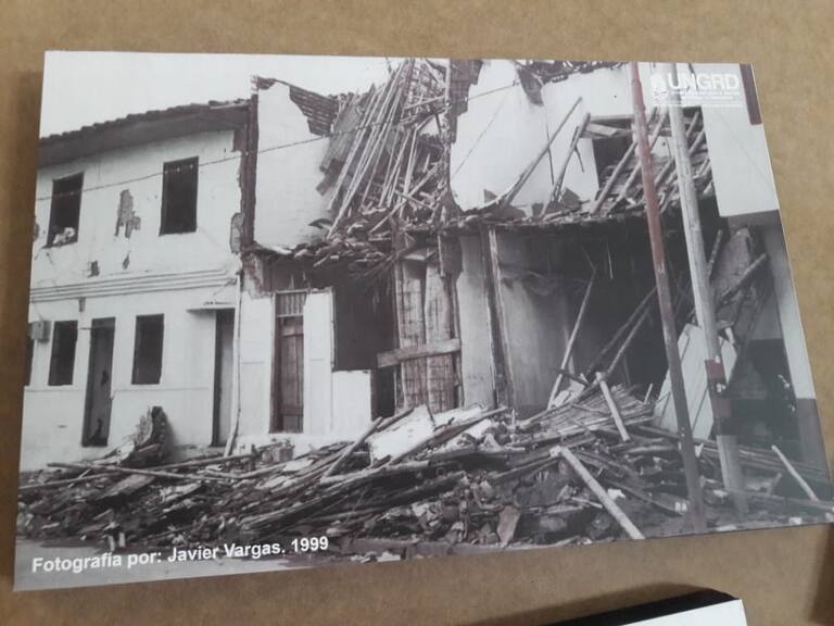 En el Centro de Convenciones de Armenia se realizara el Encuentro Nacional de Riesgo Sísmico donde hay una exposición de fotografías en blanco y negro de las afectaciones por el terremoto.