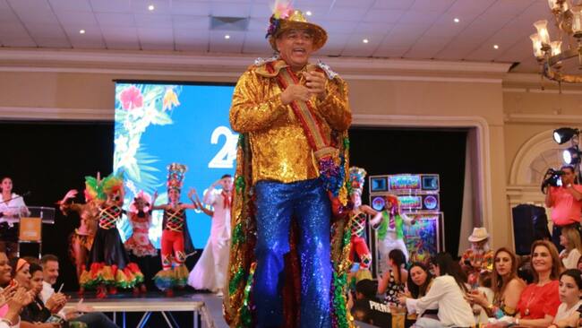 Foto 3 de 3El vestuario del Rey Momo, Freddy Cervantes, titulado ‘Rey pachanguero’ lleva una amplia capa bordada con apliques alusivos a la fiesta, camisa y pantalones brillantes en tonos rojo, dorado, azul, verde y el atuendo lo complementa un sombrero iluminado con luces tipo LED.