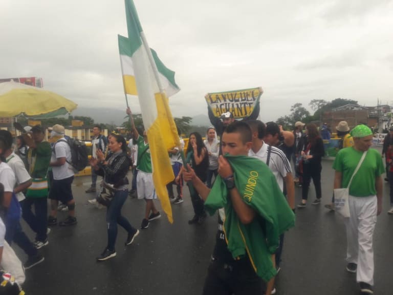 Los integrantes de la barra Artilleria Verde del Deportes Quindío también marcharon