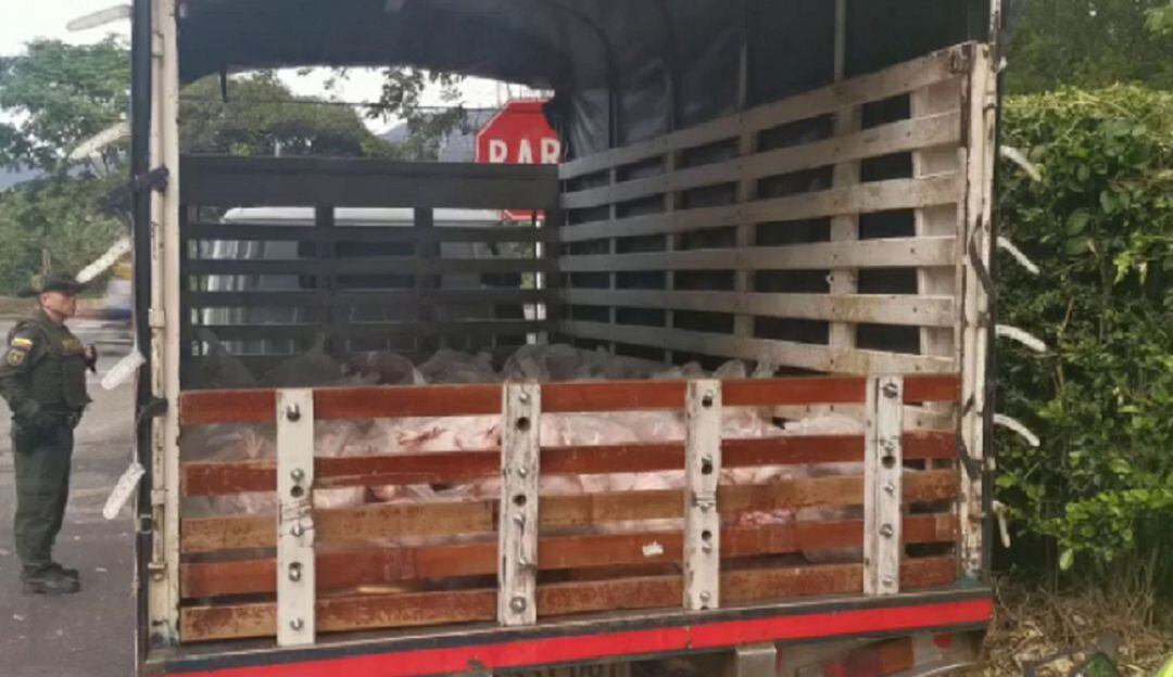 Al conductor del vehículo se le impone un comparendo de acuerdo a la ley 1801 que indica: “Almacenar, transportar o vender derivados cárnicos que no cumplan con las disposiciones de inocuidad establecidas por el Ministerio de Salud y Protección Social y garantizar en todo momento la procedencia de los mismos”.