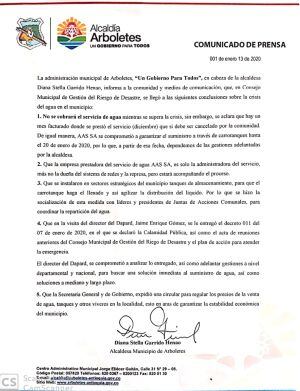 Otra de las decisiones es que la empresa ASS, que administra el servicio en Arboletes, solo suministrará el líquido hasta el 20 de enero, momento en el que la administración municipal debe encargarse de las gestiones para abastecer el agua potable.