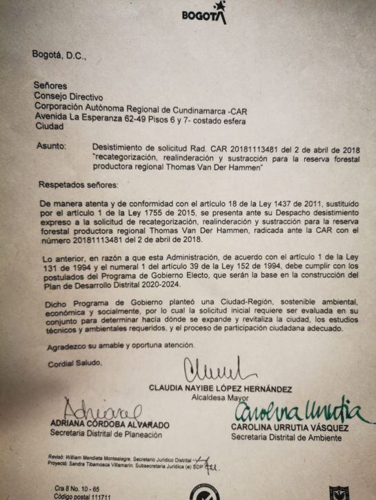 La alcaldesa de Bogotá, Claudia Lopéz, envió una solicitud a la Corporación Autónoma de Cundinamarca (CAR) no recategorizar las tierras de la reserva Van Der Hammen.