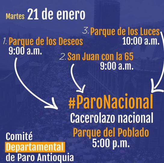 La nueva jornada de paro, programada a nivel nacional, también tendrá su lugar en la capital de Antioquia. En total serán tres puntos de encuentro.