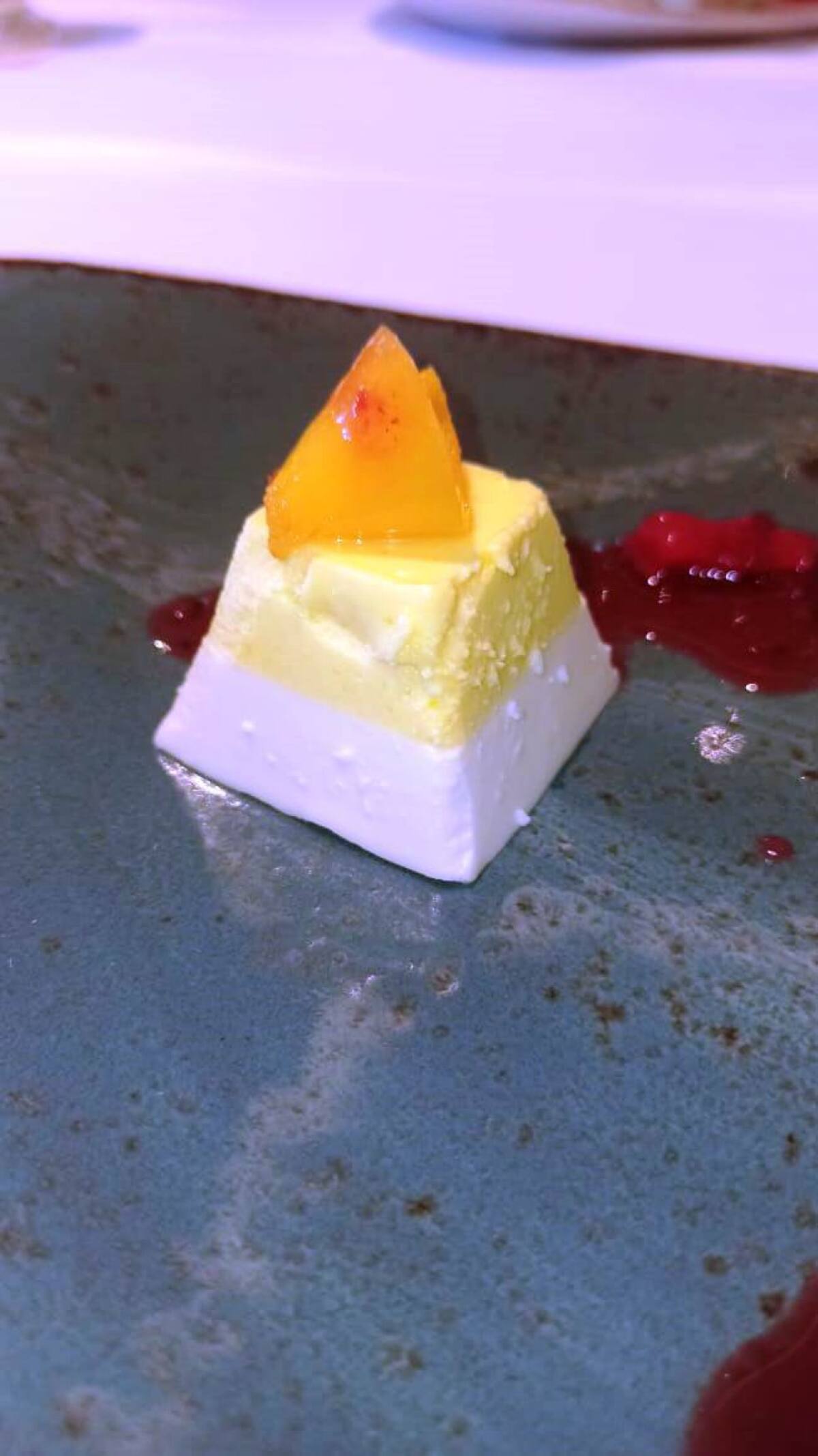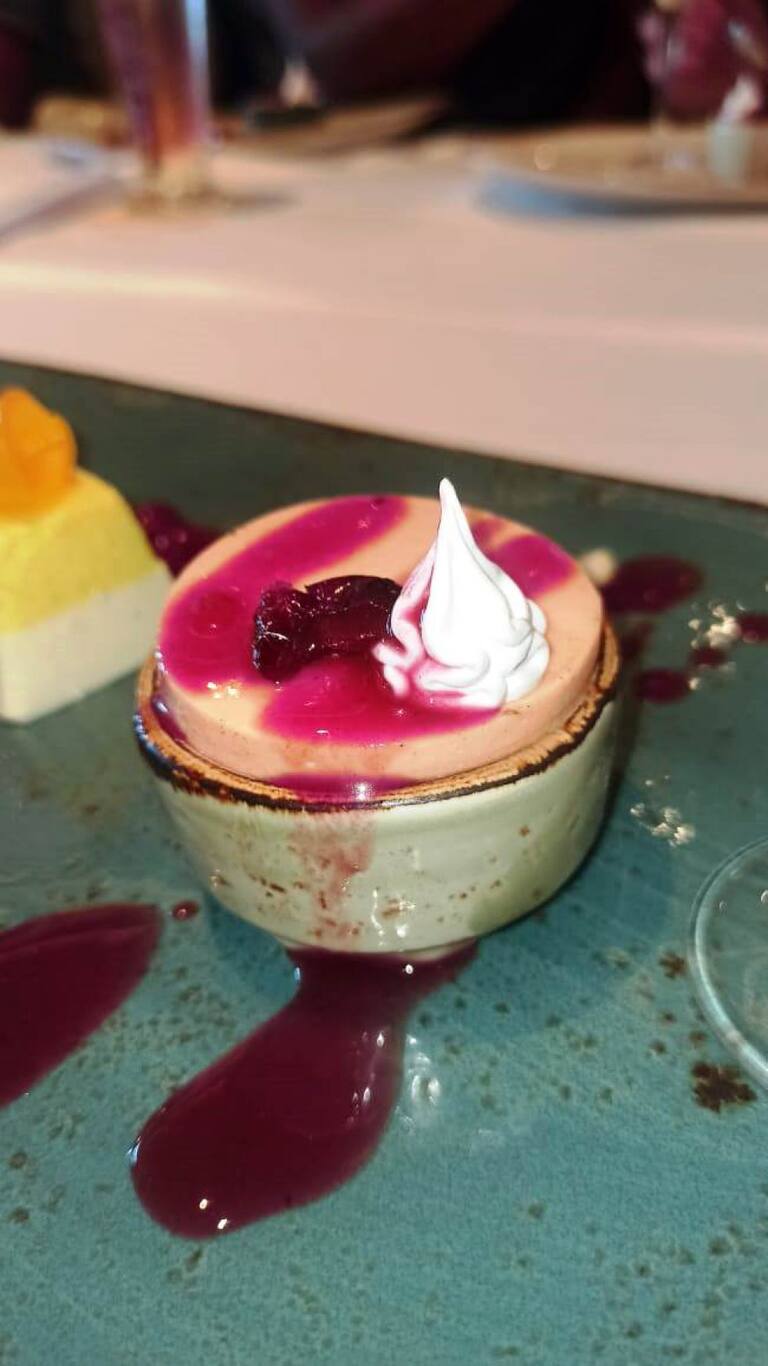 Y para el final un mini cheese cake de zapote costeño con salsa de corozo.