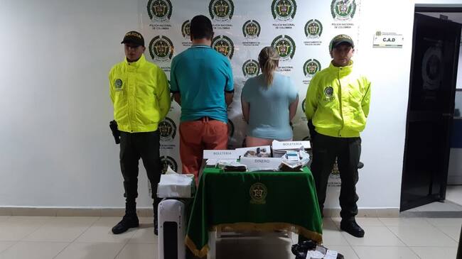 Allí las autoridades realizaron una diligencia de allanamiento y registro a un inmueble ubicado en el sector conocido como la Salida el Oro y al llegar al sitio capturaron en flagrancia a la dos personas a quienes se les halló más de 6.000 bonos fabricados en cartulina, 159 boletas donde se ofrecen carros y casas por 80 mil millones de pesos, 1 millón 90 mil pesos en efectivo producto de las ventas ilegales, entre otros elementos.
