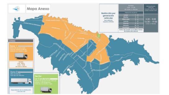 Es importante destacar que la restricción en la zona oriental de la ciudad (zona naranja) con peso bruto vehicular máximo de 8500 kilogramos será 5:30 a.m. a 8:00 a.m. y de 4:30 p.m. a 7:00 p.m.