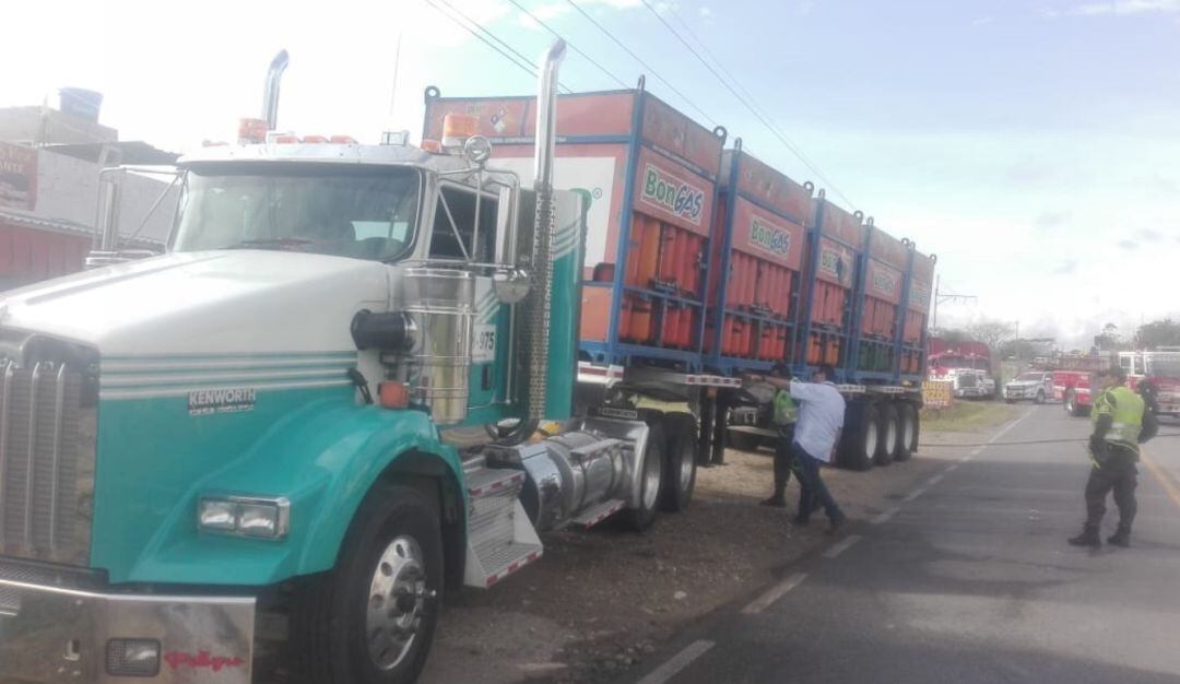 Un camión que transporta pìpetas de gas tuvo un percance al paso de un reductor de velocidad en Barbosa, Santander.