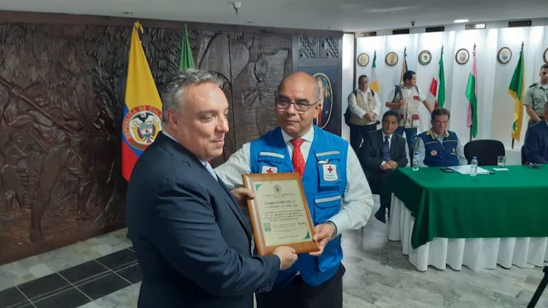 Eduardo Gonzáles director de la UNGRD impone estampa a Daniel Granada voluntario Cruz Roja, Quindío Certificado