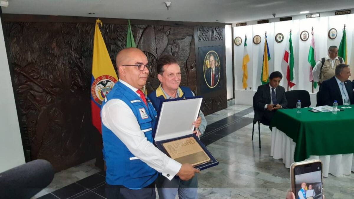 Eduardo Gonzáles, director de la Ungrd entrega reconocimiento a Carlos Hernán Arias, Pte Cruz Roja Quindío