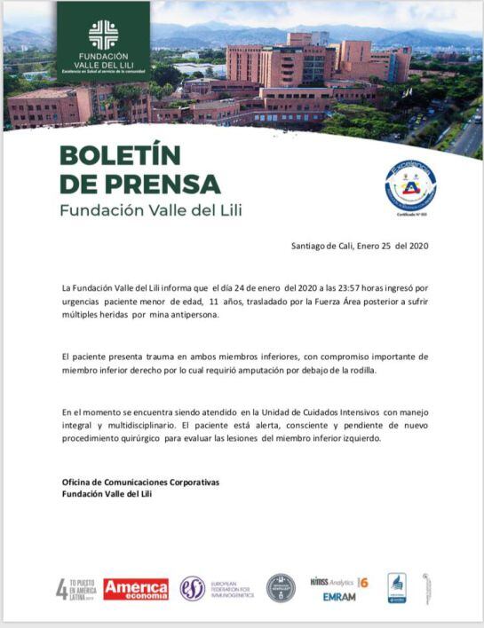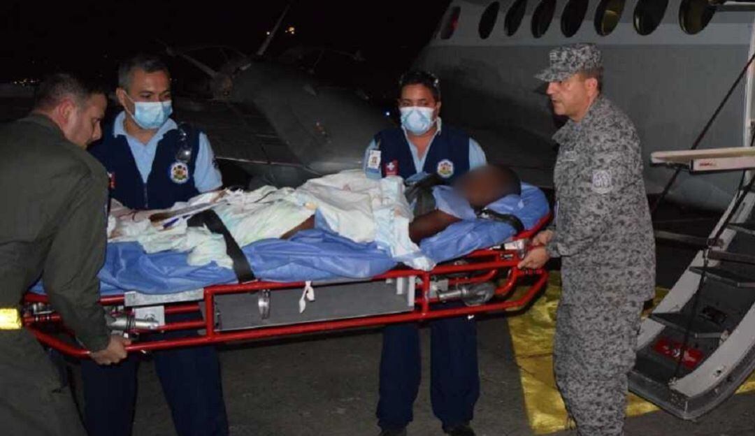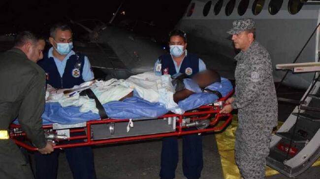 El menor quien fue trasladado desde un área rural de Tumaco hacia el hospital Valle del Lili de Cali en un avión medicalizado de la Fuerza Aérea, presentaba heridas en sus dos piernas provocado por una mina antipersona, según el Coronel Andrés Felipe Botero, Comandante del cacom 7 la rápida reacción fue indispensable para salvaguardar la vida del niño.