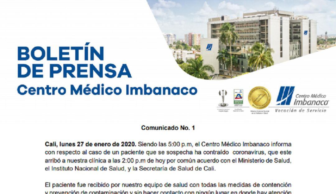 El centro médico Imbanaco, emitió un comunicado en el que confirma la llegada de un paciente, del cual se sospecha habría contraído el coronavirus.