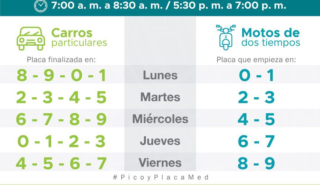 La alcaldía de Medellín informó que este lunes 3 de febrero será la rotación del pico y placa para el primer semestre de este 2020 la cual seguirá aplicando en los mismos horarios y con las mismas vías exentas.
