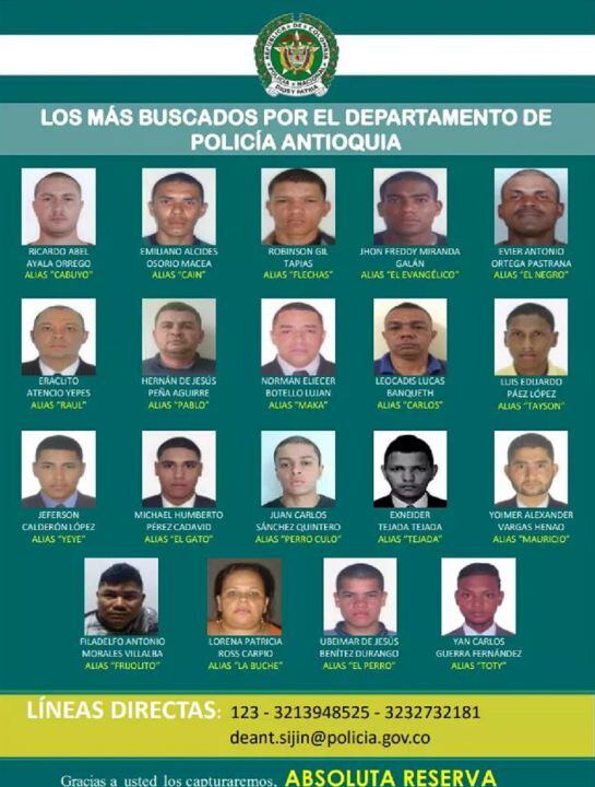 La policía de Antioquia con jurisdicción en 90 municipios actualizó el cartel con los 19 delincuentes más buscados del departamento en seis subregiones y por quienes ofrecen recompensa de hasta 87 millones de pesos para quien informe para su captura. En total son 18 hombres y una mujer, esta última identificada como alias “La Buche”, presunta coordinadora de estupefacientes del Grupo Armado Organizado Los Caucasiaticos, en Caucasia.