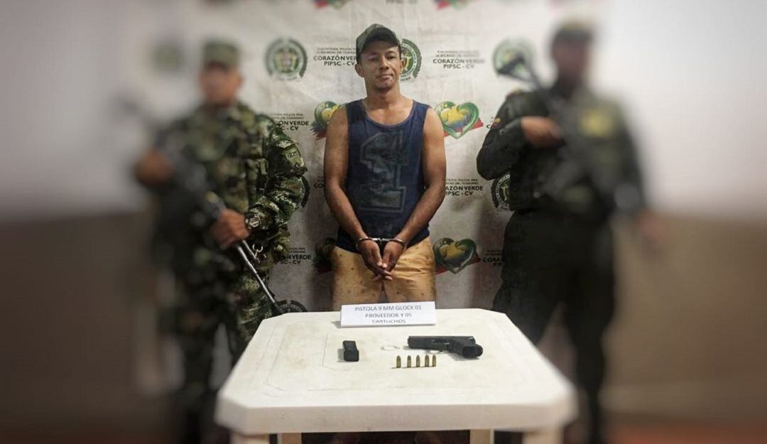 En desarrollo de las operaciones conjuntas entre las fuerzas militares y policía en el sur de Bolívar, se logró la captura de un sujeto conocido como “Ancla”, presunto cabecilla de zona de la subestructura Luis Fernando Gutiérrez del Clan del Golfo, a quien se le halló en su poder una pistola calibre 9 milímetros marca Glock con 1 proveedor y 5 cartuchos.