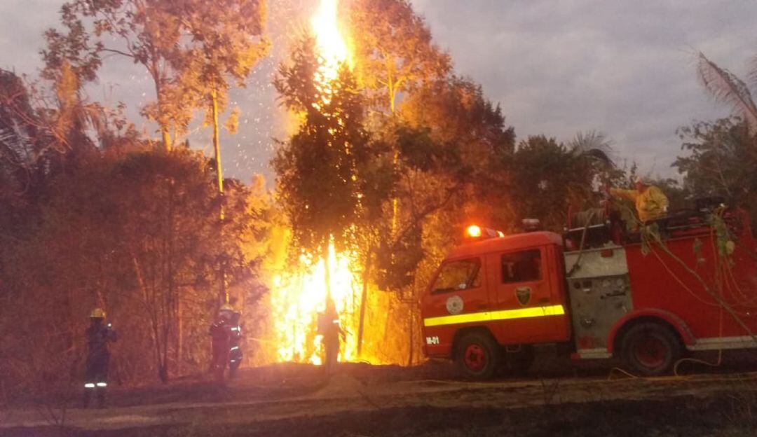 Los bomberos, soldados y voluntarios de la Defensa Civil siguen combatiendo las llamadas en el municipio de Carmen de Apicalá, donde hace seis días está activa una conflagración.