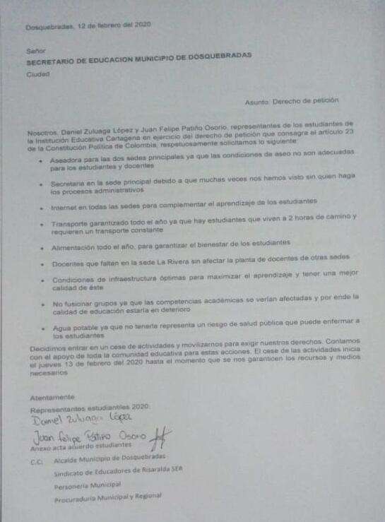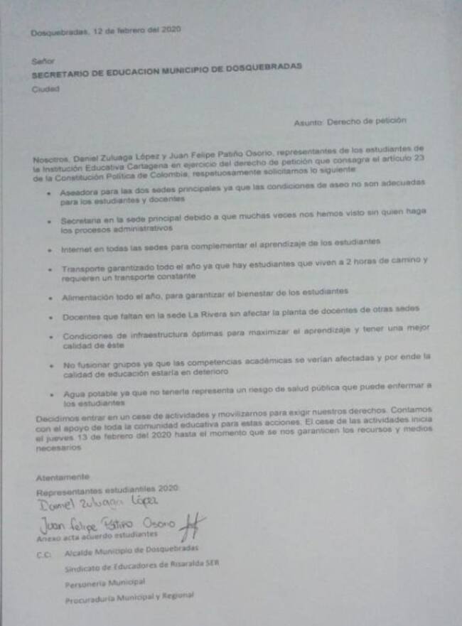 Paro indefinido de los estudiantes del colegio Cartagena de Dosquebradas