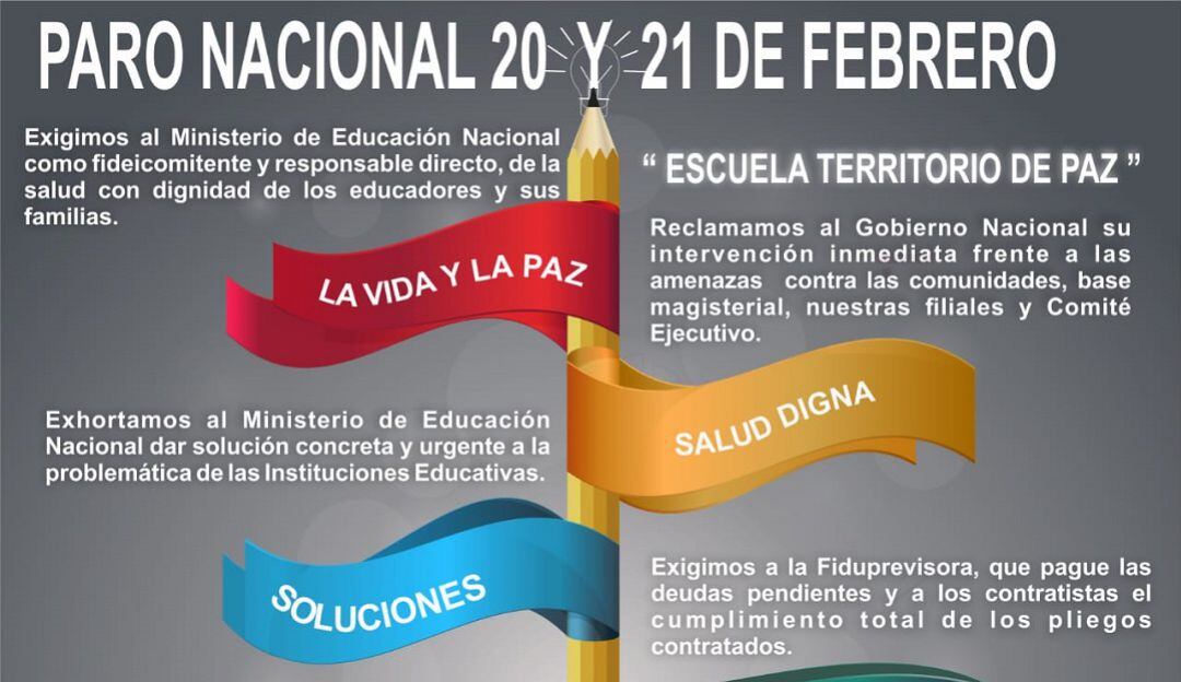 La propuesta es hacer durante el 20 de febrero asambleas informativas para socializar con profesores y padres de familia y el 21 realizar una movilización en las principales ciudades del país. En el Valle del Cauca se suman a estas actividades más de 20 mil maestros de instituciones públicas, mientras que alrededor de 180 mil estudiantes se quedarán sin clase durante dos días.
