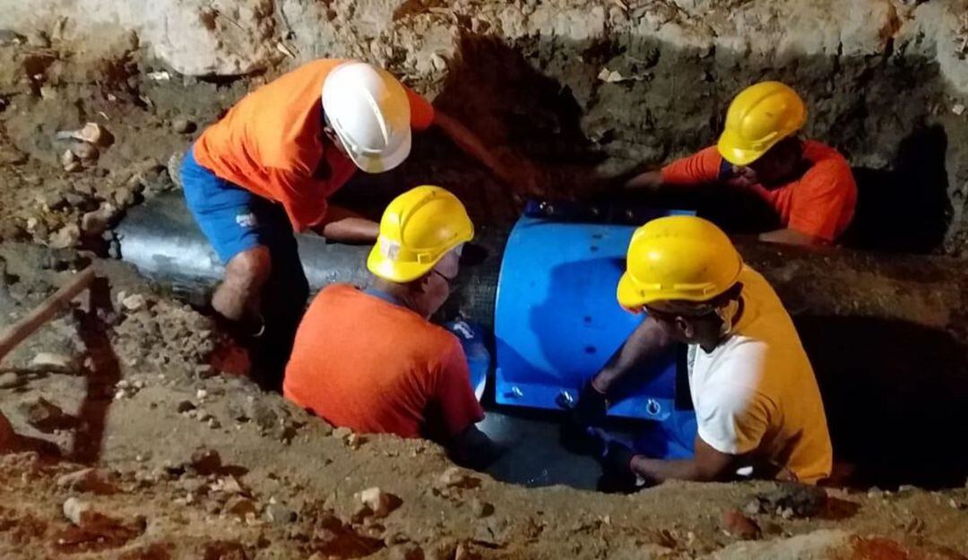 Trabajos de reparación adelantan los operarios de la empresa de servicios públicos de Santa Marta, Essmar, en una tubería en la que se ha detectado una perforación irregular que ha impedido el abastecimiento de agua en varios sectores.