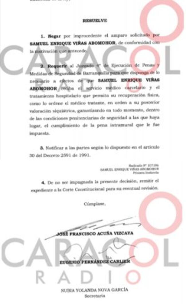 Caracol Radio conoció en primicia el documento de la Corte Suprema de Justicia que resuelve que Samuel Viñas debe estar en la cárcel, para recibir tratamiento médico y hospitalario, además de negarle que se revise su proceso, esto en respuesta a una tutela que éste interpuso por supuesta vulneración de sus derechos.